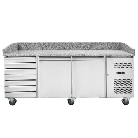 Entwickelt, um den Anforderungen an Schnelligkeit und Effizienz von Gastronomieprofis gerecht zu werden, vereint der Pizzatisch Dynasteel hohe Leistung und Langlebigkeit. Ausgestattet mit 2 vollflächigen Schwenktüren und 7 geräumigen Schubladen ist dieser Tisch eine perfekte Lösung für Küchen, in denen die Optimierung des Raums und der schnelle Zugriff auf Zutaten entscheidend sind.