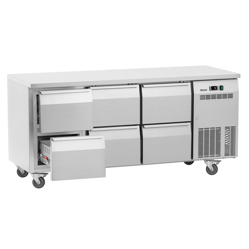Ontworpen om trots de meest veeleisende omstandigheden te weerstaan, kan de werkbank efficiënt werken tot een omgevingstemperatuur van 43°C. Dankzij het intuïtieve ontwerp bevat het een gemakkelijk te gebruiken thermostaat voor een nauwkeurige temperatuurregeling, essentieel voor het optimaal beheren van opgeslagen producten.